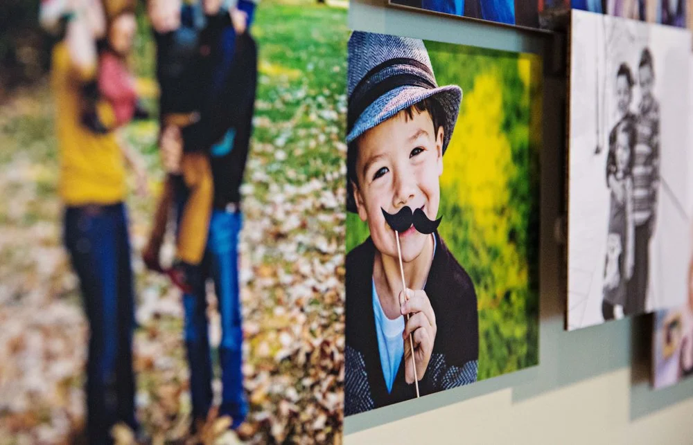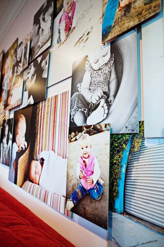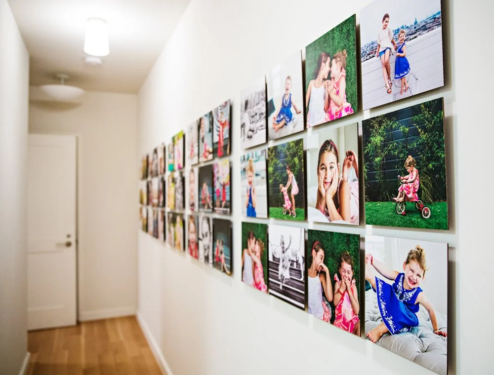 Layered galleries are custom designed to fit your space and session photos best. The photos are printed on a masonite hardboard and then laminated for durability and to resist little fingers. The prints are prepared for installation with foam backing of different depths to give a layered look.